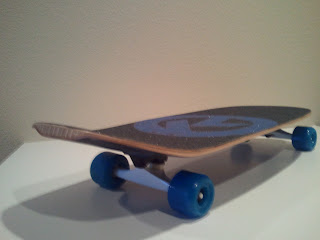 To give you an idea of the size and what the final result will become, I set some trucks and wheels on the in-progress deck.